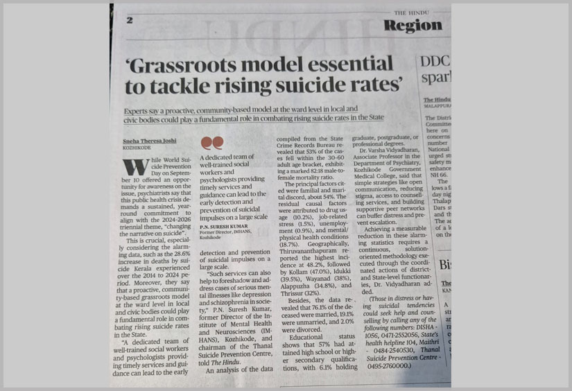 കേരളത്തില് ആത്മഹത്യാ നിരക്കു കുറഞ്ഞന്നു സൈക്യാട്രിക് സൊസൈറ്റി